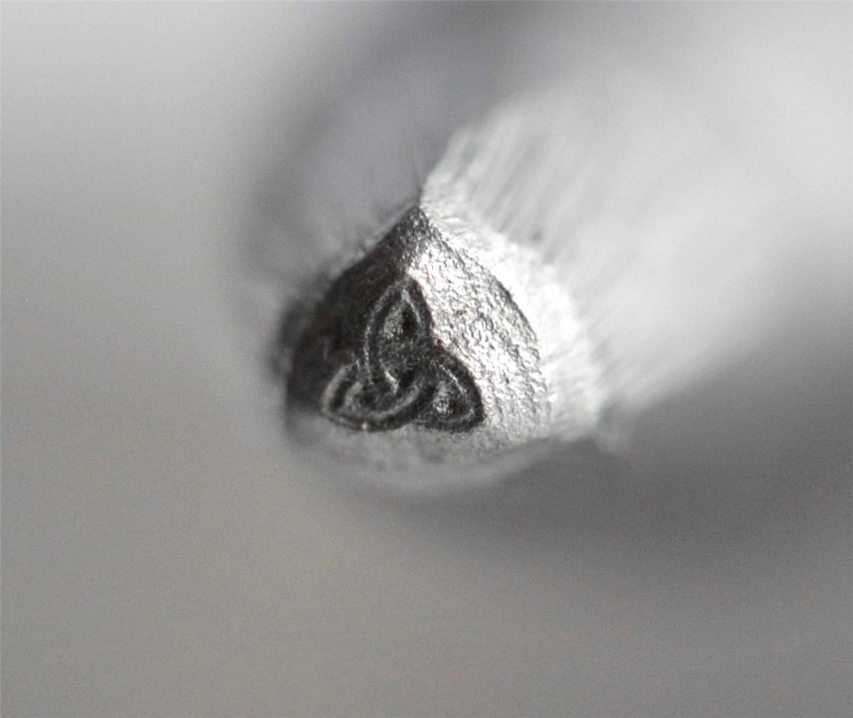 The 1/16" Steel Triquetra Celtic Knot Stamp is built for precision metal stamping in jewelry making, bullion marking, leather crafting, and various arts and crafts. Our hardened steel hand stamp delivers consistent, crisp impressions with industrial-grade durability. Designed for steady control, it pairs a compact 3" (76 mm) length with a fine 1/16" (1.5 mm) engraving diameter to create delicate Trinity knot details.
