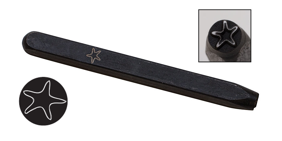 Meet the 5 mm Starfish Elite Design Stamp, a precision stamping tool crafted from black-coated carbon hardened steel for lasting durability. This laser-engraved design measures 5 mm and is clearly marked on a square shaft for accurate alignment during use.
