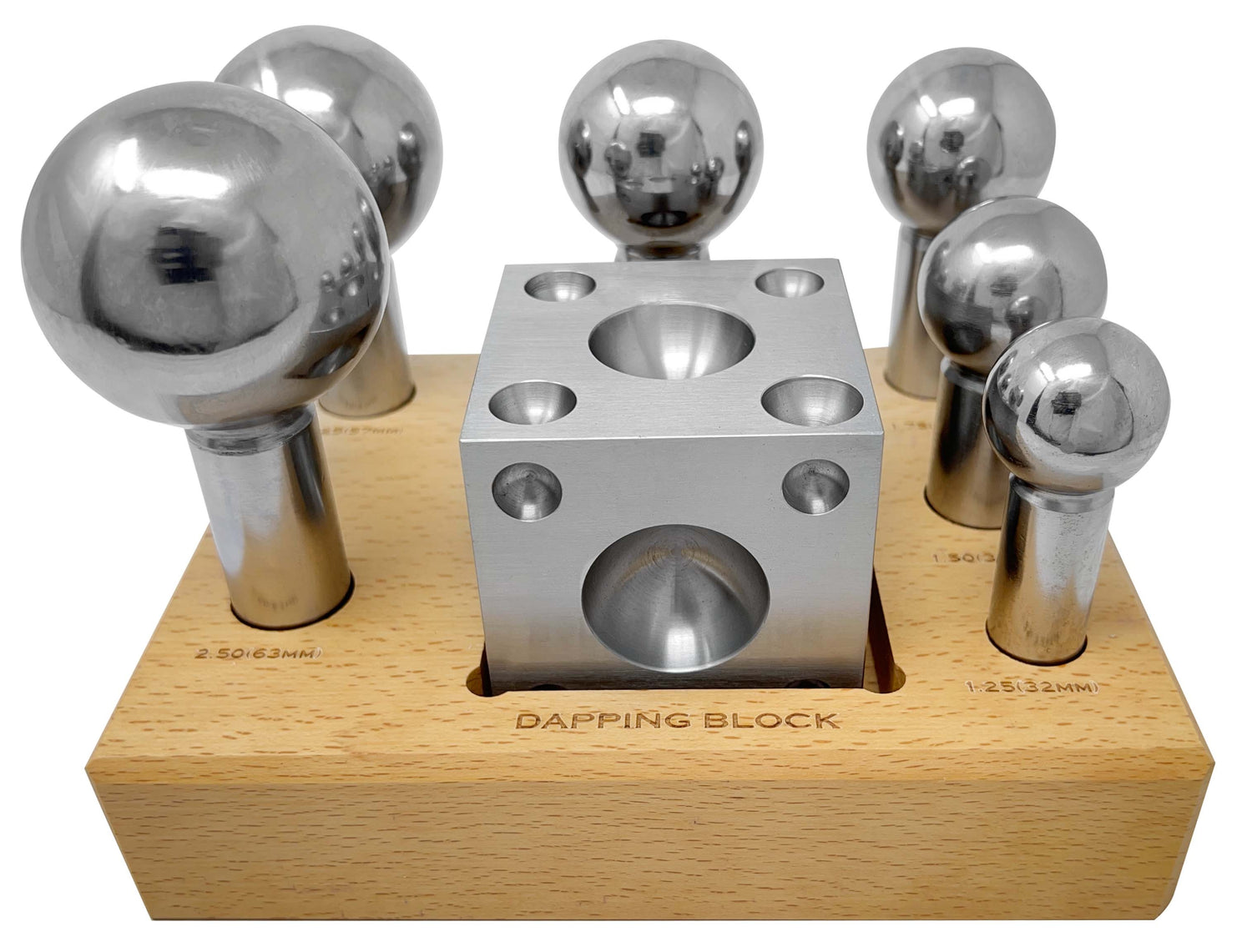 The Dapping Set of 7 Pieces 1.25" - 2.5" is a must-have for jewelry makers and metalsmiths seeking reliable doming and forming results. This seven-piece steel kit includes daps from 1.25" up to 2.5" and a large wooden dapping block for stable, precise doming of sheet metal.