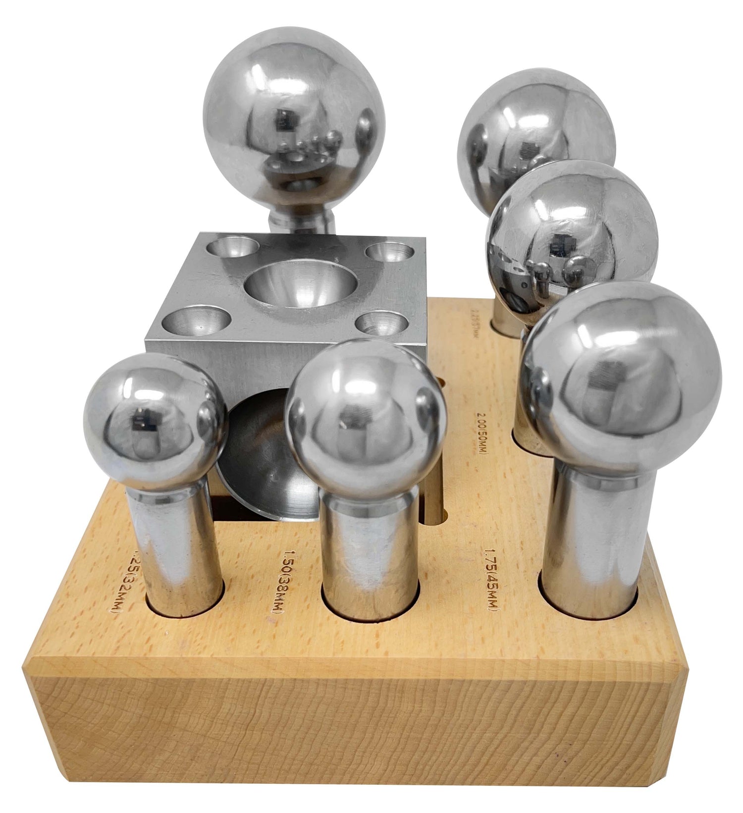 • Seven-piece steel dapping set with sizes 1.25" to 2.5"
