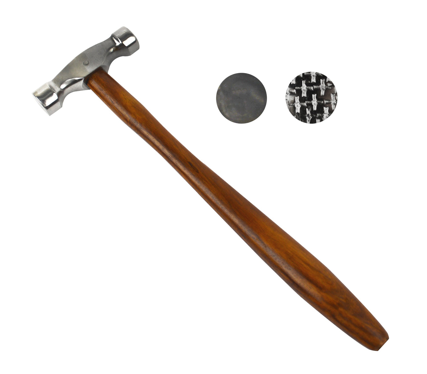 The 9-1/4" Mini Designer Texturing Hammer delivers precision and style for metal forming and texturing tasks. Constructed with a highly polished steel head and a dark wooden handle, this tool offers durability and comfortable control for detailed metalworking projects. This texturing hammer features a textured face on one side and a plain, smooth-faced opposite for clean, controlled strikes. Ideal for forming, shaping, and texturizing metal surfaces, it supports artistic textures as well as functional shaping.
