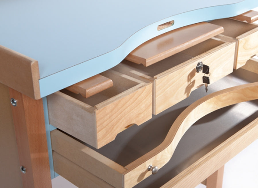 Three spacious drawers keep tools and findings organized, while two aluminum catch trays protect the work surface from spills and debris. The bench also includes two pull-out arm rests for added comfort and a large pull-out workspace that expands as you need it—perfect for tight locations without sacrificing workflow.