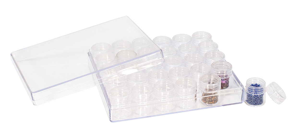 Introducing the 30-in-1 Plastic Storage Containers, a compact, see-through solution for organizing small items. This set holds thirty 1" clear round containers in a single 6" x 5" x 1" box, delivering a space-saving storage unit you can keep on a desk, in a drawer, or in a craft space. Each container features a screw-on lid to keep findings, beads, or other tiny items securely contained, and the lids stay tight for long-lasting protection. Beads are not included; shown for photo reference only.