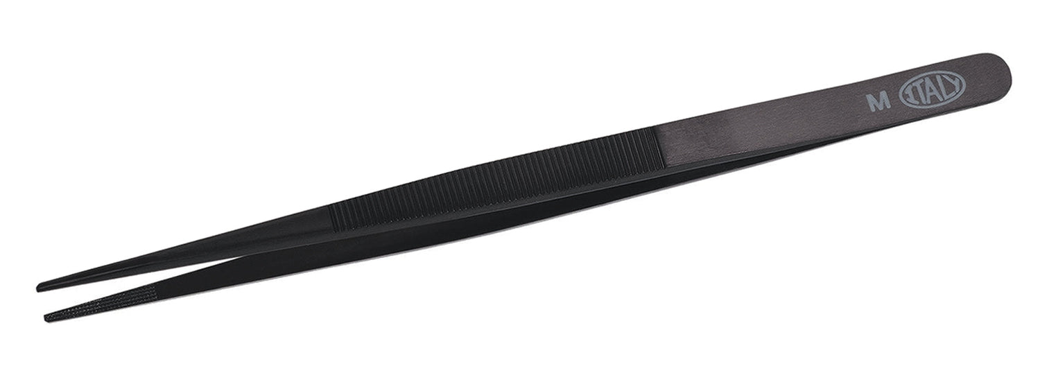 These tweezers are designed for versatility and comfort. The medium length provides balanced control for extended use, while the black finish minimizes glare and enhances visibility on light backgrounds. Perfect for precise work where grip stability matters.