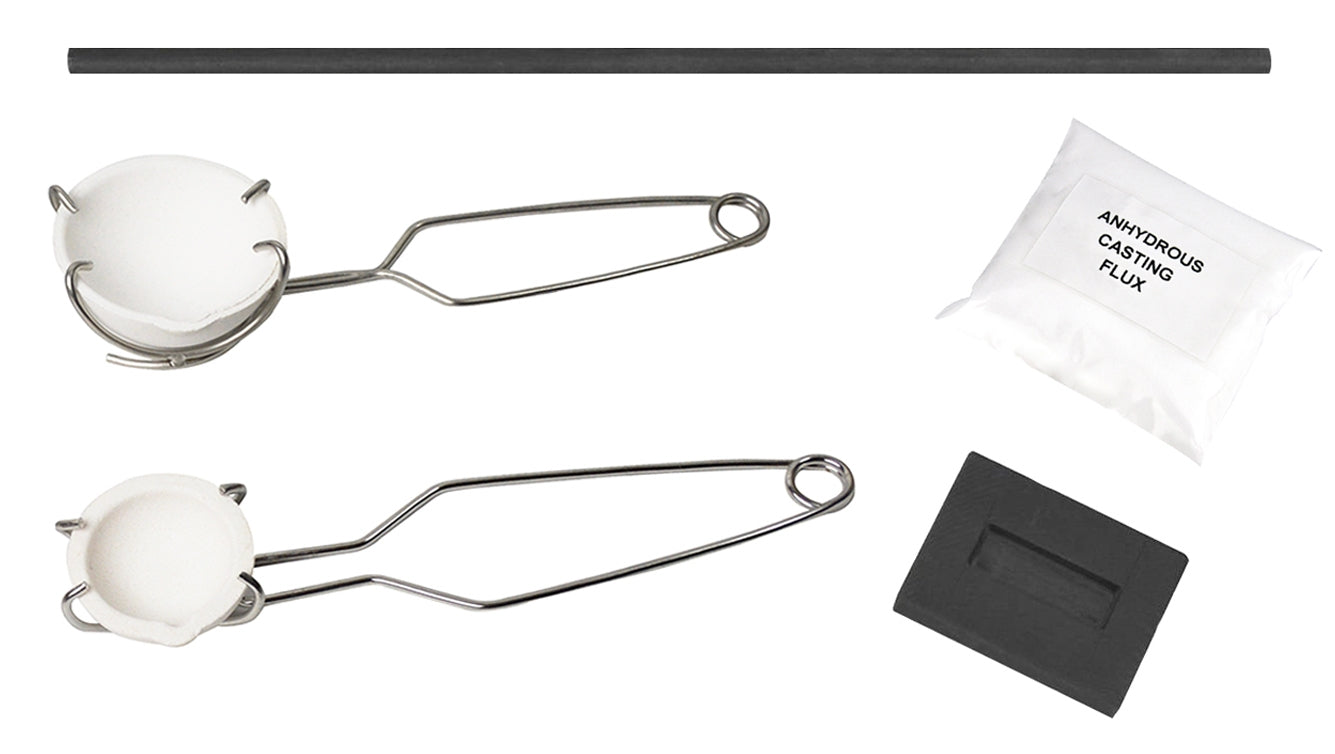 Metal melting set with ceramic crucibles, tongs, borax flux, graphite mold, and stir rod for jewelry making and metal casting.